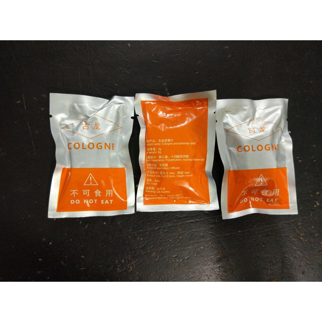 Cologne Aromatherapy SheetFungsi : Sebagai pengharum ruangan, umunya digunakan bersama dengan Humidifier atau DiffuserCara Penggunaan : Dicemplungkan ke dalam air, otomatis akan tercampur dengan air dan mengeluarkan wangi cologne.Harga per 1 sashet.1 Sashet terdiri dari 4pcs cologne (bentuk cologne kotak, seperti es batu kecil, ada di gambar k