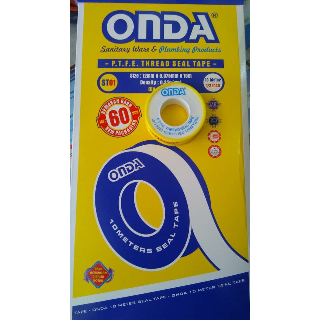 Seal Tape High Quality ONDAHarga diatas adalah harga 1 rollUkuran 12mm x 0.075mm x 10mDensity : 0.35g/cm3Berfungsi melapisi drat dari peralatan seperti keran/fitting/nipple/dll untuk mencegah kebocoran.harga pe