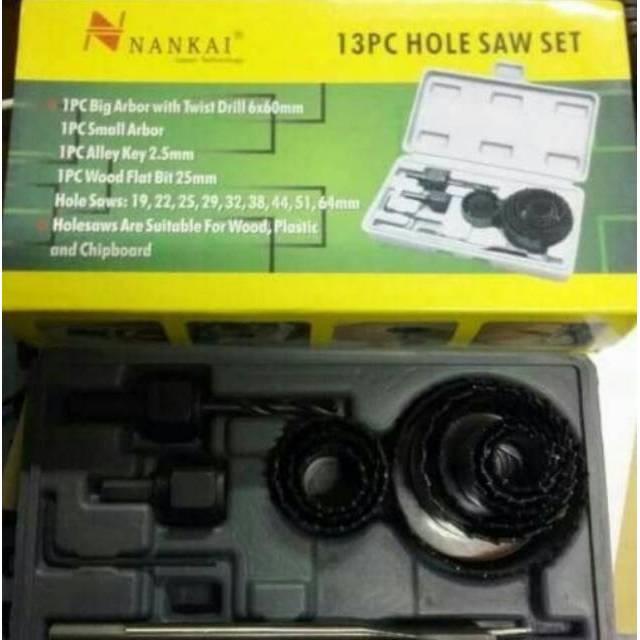 Harga : 1 SetMERK NANKAI ( kemasan Hijau)Hole Saw sangat cocok untuk melubangi kayu, plastik, pvc, plat tipisDengan size :19mm, 22mm, 25mm, 29mm, 32mm, 38mm, 44mm, 51mm, 64mm1Pc Alley Key 2.5mm1Pc Small Arbor1Pc Wood Flat Bit 25mm1Pc Big Arbor with Twist drill 6x60mmHarga Super Grosir !!!Reseller dan Partai, Welcome!!!#matabor #mataborkayu #mataborbulat #holesaw #holesawset #holesawkayu #woodholesaw #blackfoot #perkakas #perkakastukang #perkakaspertukangan #alatpertukangan #alattukang #hargag