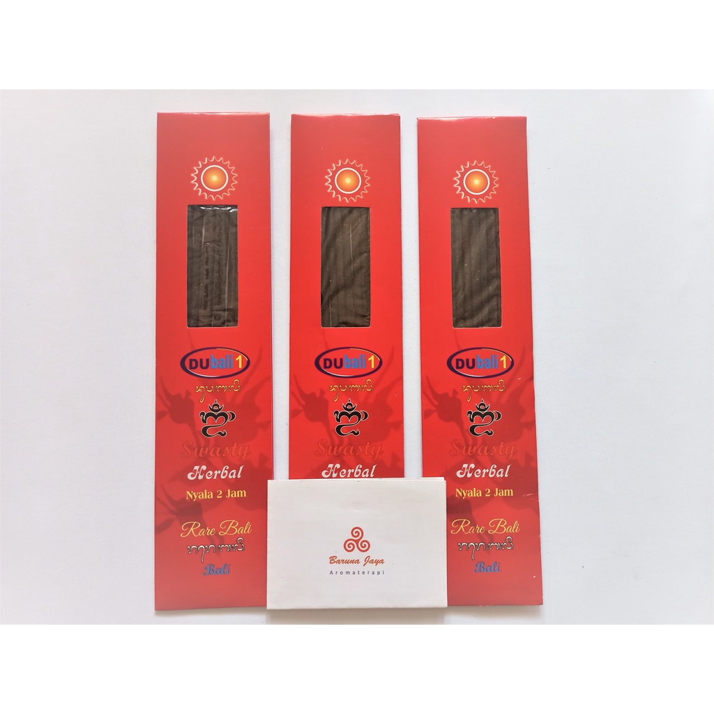 MOHON BACA SAMPAI AKHIR, KAMI TIDAK MELAYANI KOMPLAIN ATAUPUN PENGEMBALIAN PRODUKDibuat dari herbal murni, sehingga aman dan sehat untuk digunakan.Aromaterapi Ayur Herbal Bali Dubali Swasty Merah, wanginya hangat, lembut dan dominan manis rempah-rempah, wanginya mirip permen karet/ bubble gum. Dibuat dari campuran kayu cendana, majegau, menyan, onem, umbi-umbian/akar-akaran, kemudian disatukan dengan minyak susu dan diproses sesuai tradisi serta kesakralan Bali.Digunakan sebagai aromaterapi, memberikan kita suasana nyaman, tenang, damai dan hangat, sekaligus mampu membersihkan udara dari residu-residu negatif.Sangat cocok digunakan untuk sembahyang, upacara, meditasi dan yoga. Dapat juga digunakan sebagai pewangi ruangan, galeri, butik, teman menulis, membaca, serta membangun atmosfer pertunjukkan.Aromaterapi berbentuk stick. Digunakan dengan cara dibakar seperti obat nyamuk bakar.Harga tercantum adalah harga 1 BUNGKUSFoto hanya ilutrasi keperluan estetis.Setiap bungkus berisi 9 batangTiap batang menyala : +/- 2 jam- Kemasan lebih besar dari bobot barang, karenanya berat barang dihitung berdasarkan volumetrik (panjang x lebar x tinggi x 1kg : 6000)- Silahkan pilih kurir sesuai kebutuhan Anda. Layanan kurir reguler memakan waktu lebih lama dibanding layanan kilat.- Setelah masuk kurir dan kami update no resi, maka barang ada di bawah tanggung jawab kurir. Apabila terjadi masalah pengiriman, kami hanya dapat membantu dengan mengontak kurir.- Enak tidaknya aroma adalah soal selera, kami sudah berusaha mendeskripsikan aroma di keterangan produk semampu kami, berilah review ataupun penilaian yang sesuai- Dengan berbelanja di Baruna Jaya Aromaterapi, maka Anda telah setuju dengan segala ketentuan di